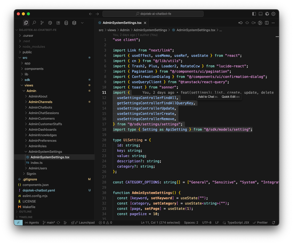 - AdminChatbots.tsx on Dojotek AI Chatbot frontend repo for example of React Query hooks usage